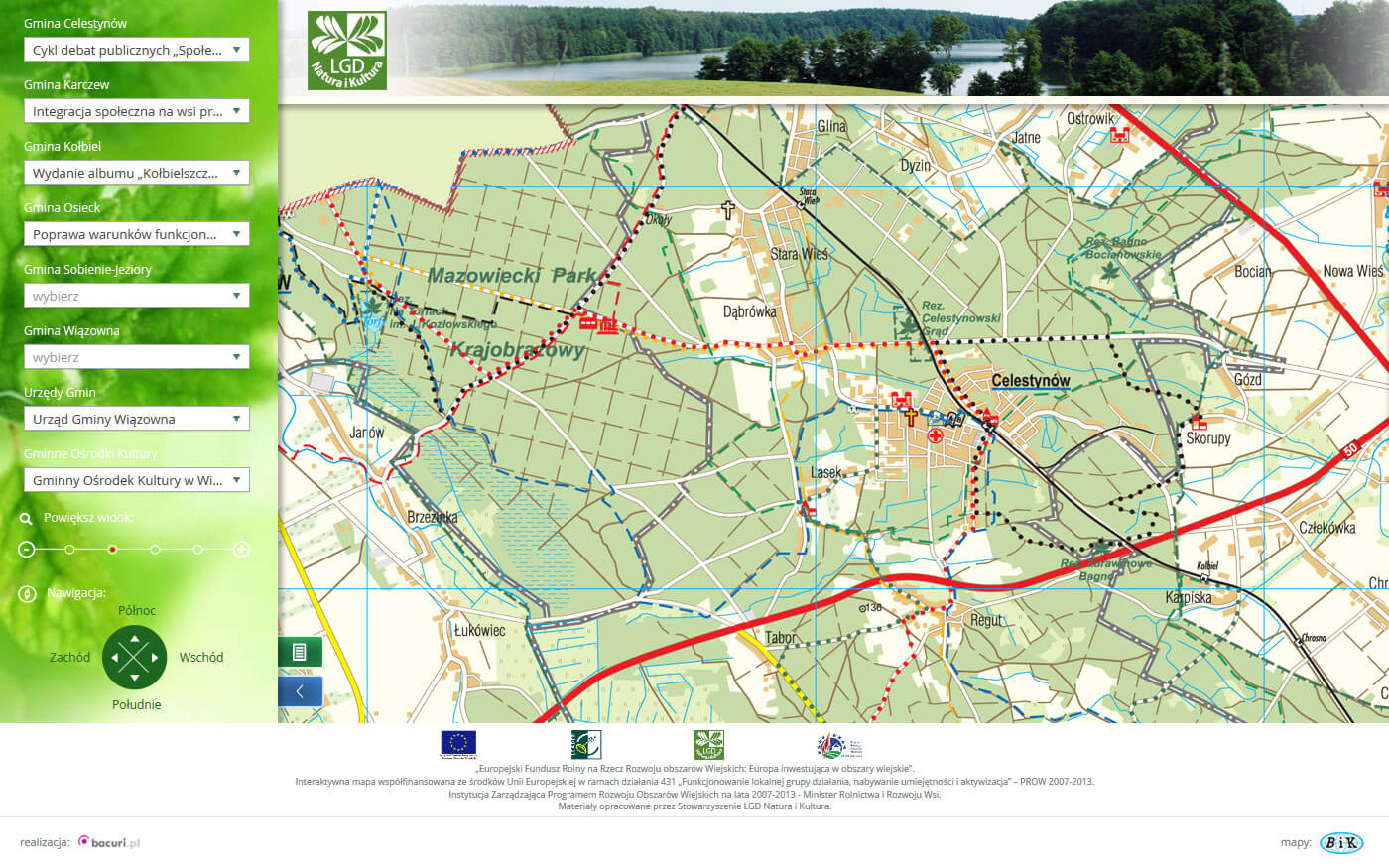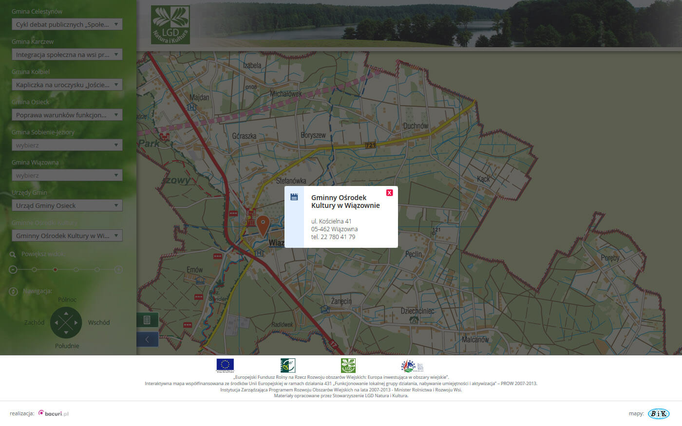 W pełni interaktywna mapa pięciu gmin wiejskich powiatu otwockiego. Przygotowany przez nas panel administracyjny pozwala na samodzielne dodawanie punktów na mapie i ich opisów wraz ze zdjęciami.